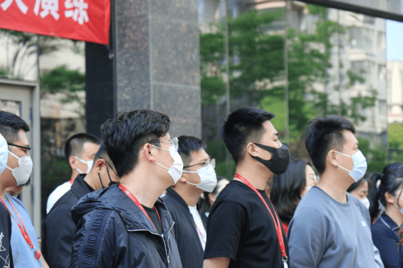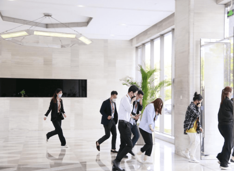 與此同時,應(yīng)急廣播在接到“火情”第一時間響起,相關(guān)樓層員工聽到廣播在安全員的指揮引導下,快速有序地集體撤離至安全集合點,由相關(guān)負責人統(tǒng)計清點人員。