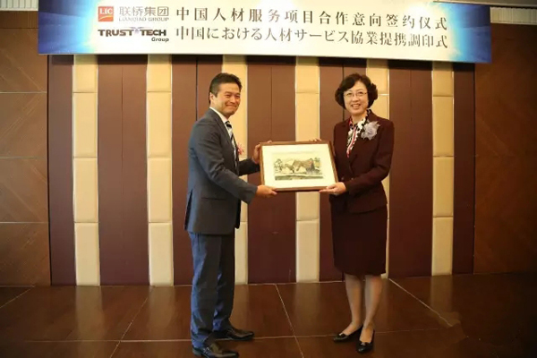2016年5月18日上午,聯(lián)橋集團(tuán)與株式會(huì)社TRUST TECH“中國(guó)人材服務(wù)項(xiàng)目合作意向簽約儀式”在東京舉行,聯(lián)橋集團(tuán)董事長(zhǎng)慕镕鍵與株式會(huì)社TRUST TECH社長(zhǎng)西田穣代表雙方簽署了合作協(xié)議,威海市委副書記、市長(zhǎng)張惠,高區(qū)黨工委書記、管委會(huì)主任劉偉,威海市商務(wù)局局長(zhǎng)鄧勇,聯(lián)橋集團(tuán)董事、副總經(jīng)理于福杰等領(lǐng)導(dǎo)出席儀式。