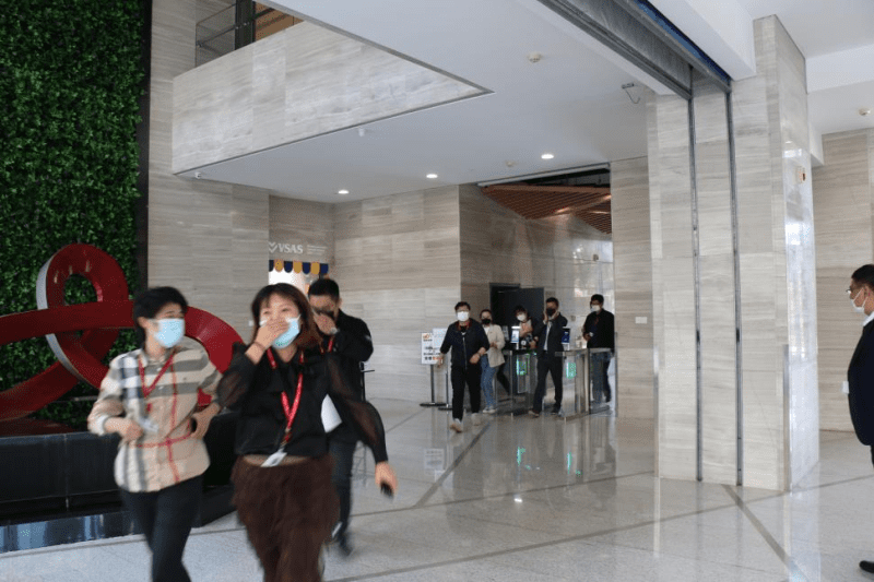 與此同時,應(yīng)急廣播在接到“火情”第一時間響起,相關(guān)樓層員工聽到廣播在安全員的指揮引導下,快速有序地集體撤離至安全集合點,由相關(guān)負責人統(tǒng)計清點人員。