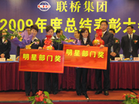 董海波副總經理首先宣讀了《聯橋集團關于表彰2009年度先進的決定》,授予進口部“卓越貢獻獎”,紡織八部、紡織九部“明星部門獎”,紡織二部等10個部門“先進部門獎”,授予徐建禮等10名員工“敬業(yè)精英”,孫永進等27名員工“先進個人”,董文忠、張建軍2名員工“團隊協(xié)作獎”榮譽稱號。頒獎儀式結束后,獲獎部門代表進行了大會發(fā)言,總結了2009年各項工作,匯報了2010年工作計劃。