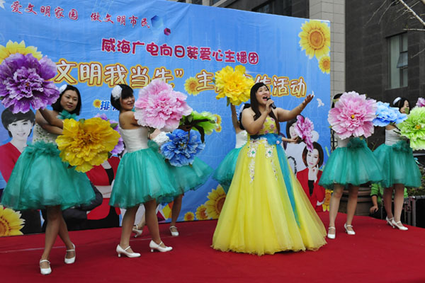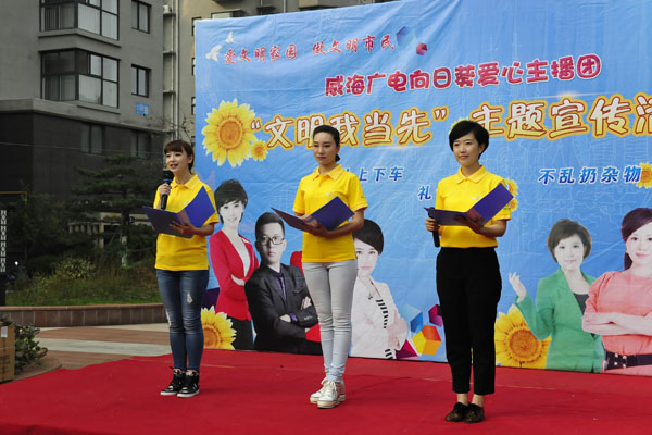 2015年10月16日,威海廣電攜手聯(lián)橋集團(tuán)在集團(tuán)海天一品社區(qū)噴泉廣場舉行“文明我當(dāng)先”主題宣傳活動。威海電視臺愛心主播白雪、張帆、齊賽、劉偉豪等親臨現(xiàn)場,通過節(jié)目表演、知識講解,做游戲等形式,與大家互動交流,在輕松愉快中傳播“愛文明家園做文明市民”的理念。